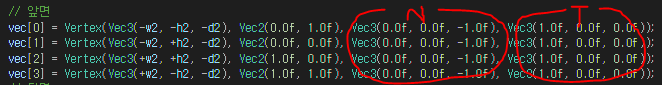 코드에서 정점을 만들 때 Normal 벡터와 Tangent 벡터 정보가 있다. Normal 벡터와 Tangent 벡터를 알고 있다면 이 둘의 외적이 Binormal 벡터이다. 왜냐하면 a벡터와 b벡터의 외적은 두 벡터와 직교하고 두 벡터를 포함한 평면과 수직이기 때문이다. Tangent x Normal 순으로 곱해야 한다. 순서가 바뀌면 Binormal이 반대가 된다.