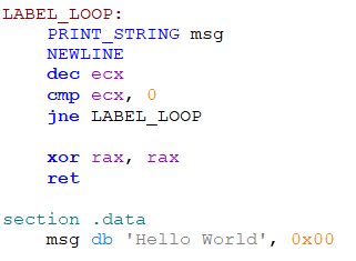 위는 Hello World를 10번 반복해서 출력하는 반복문이다. 반복문이지만 사실상 이전 분기문과 다름없다. msg 변수를 출력하면서 ecx를 초기에 10으로 설정하고 (사진에서 짤림) 1씩 ecx를 감소시킨다. 그리고 0과 비교해서 0이 아니라면 다시 LABEL_LOOP를 돌린다. 따로 반복문을 위한 문법도 있다.