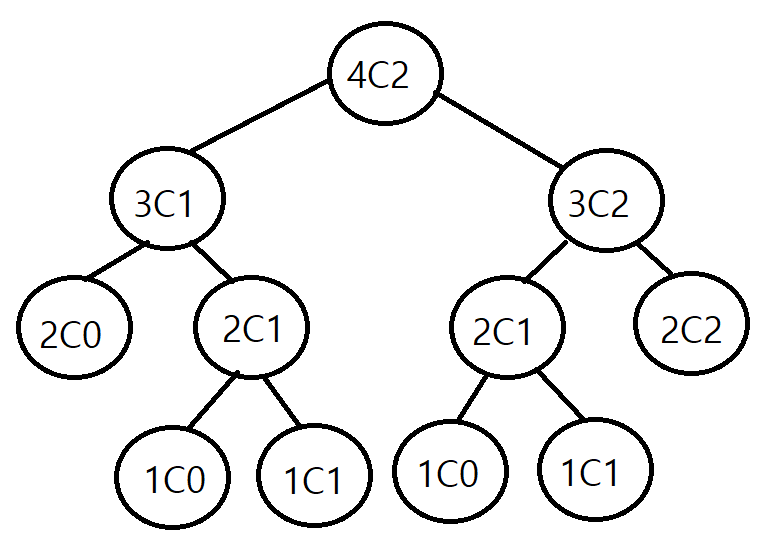 4C2를 재귀로 계산할 때 이렇게 진행되는데, 1C0,1C1,2C1이 두번씩 계산되고 있다. 4C2같은 작은 계산에도 이렇게