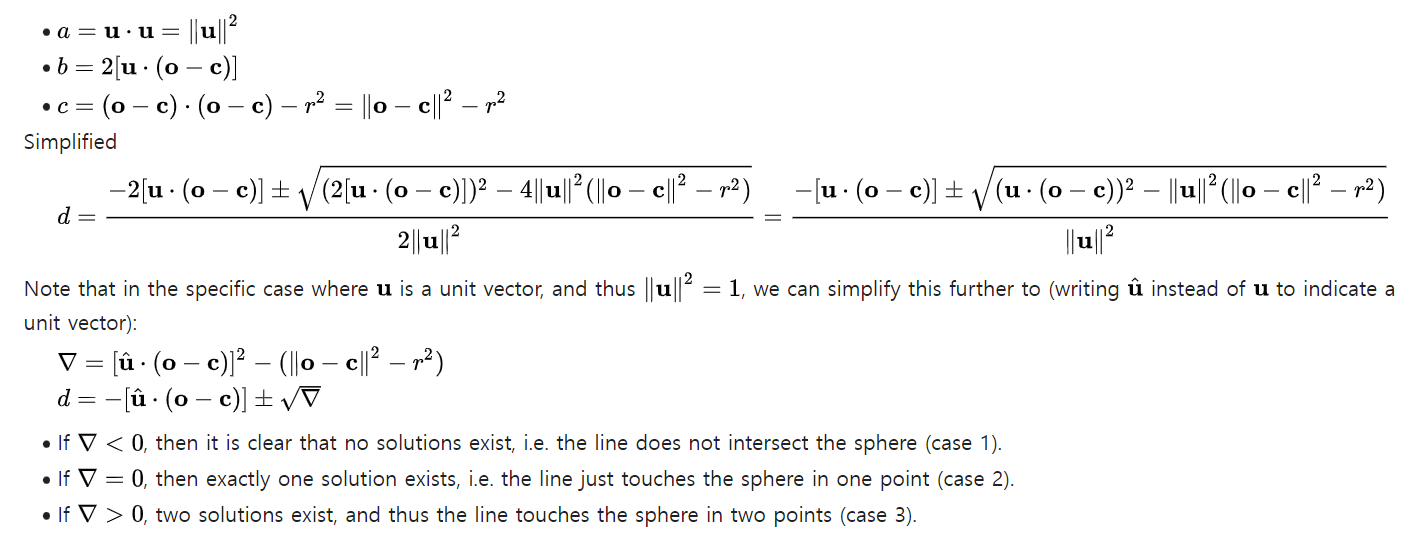 x = o + du를 구의 방정식의 x에 대입하고 d에 대해 정리하면 d에 대한 2차방정식이 만들어진다.