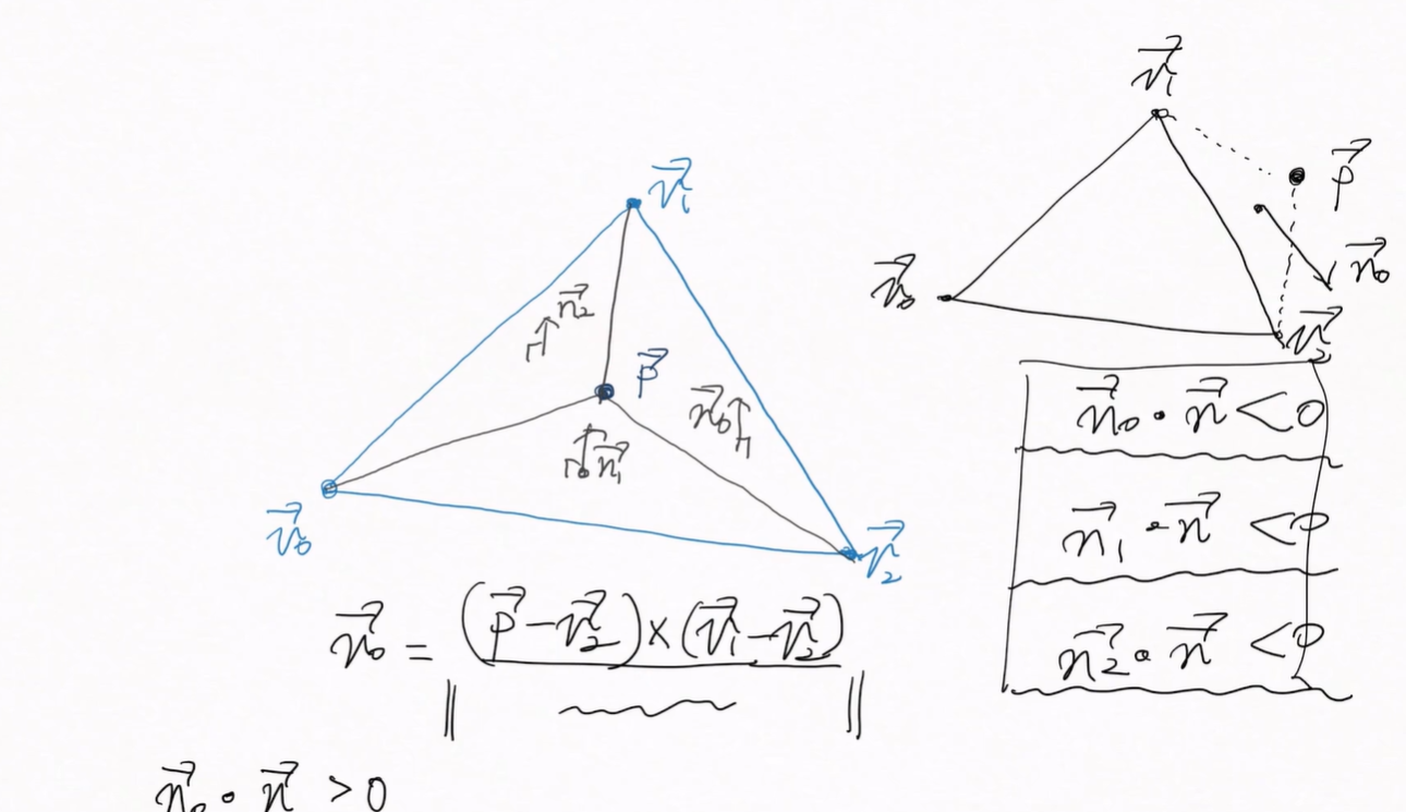 외적한 벡터는 평면의 법선벡터와 같을 것이다. 이렇게 세 정점과 p를 외적한 값이 각각 n0,n1,n2라고 할 때,