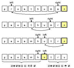 그리고 left와 right이 중앙으로 이동하면서 left는 기준 값보다 큰 값, right은 기준 값보다 작은 값을 찾는다.